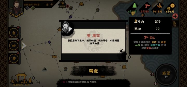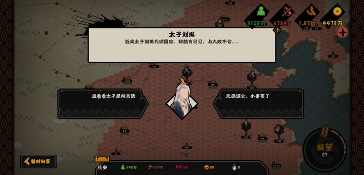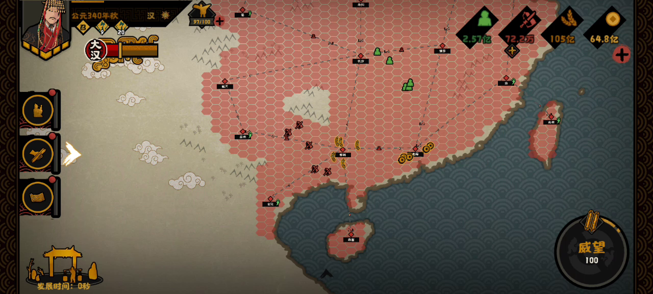 大汉第一局: 开局的时候,因为无知拒绝了和亲,于是被迫和匈奴打了480年的仗,前期很菜战斗力根本跟不上,后期基本无敌,前期常常粮草不足,后期粮草躺着用,八王相继叛乱,逐个击破。后期打匈奴,打到匈奴只剩三座城,以40万兵力与匈奴决战。最后,匈奴灭,华夏安康! 不喜勿喷