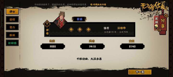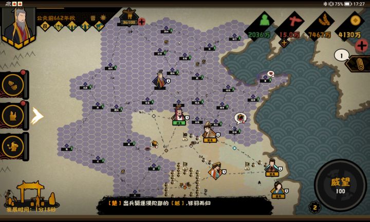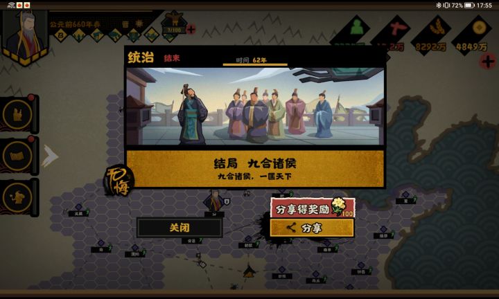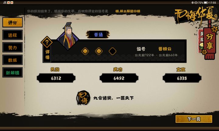 总算是完成这个结局了,会盟了七八次。每次会盟后,都出去打威望,最后会盟成功后,都快统一了。然后看了一下分数,想着打个三星的分数起来,把楚和吴打完后,算上结局分数不够三星,懒得打了,直接结束了。