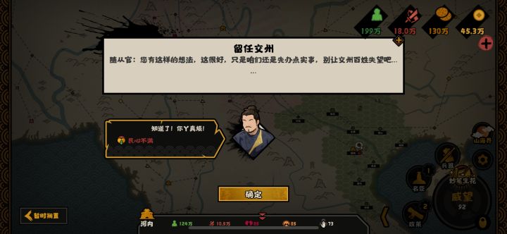 独立还要等个90秒,但无所谓了,十年之期以至,靖安之乱——启动碰巧我李靖政策还没点过,一会直接打首都了看了下地图,能从西山直接打到长安,不打治所嘻嘻,我也来尝尝但宗主的滋味唐:被打到家门口了,但是不知道怎么回事,这BUFF一层没上,是不是BUG啊?安南:我不知道你BUFF有没有BUG,我只知道我要李靖启动了临死前的反扑,不过我有萧何,你打我只会让我变得更加强大不亏是盛唐