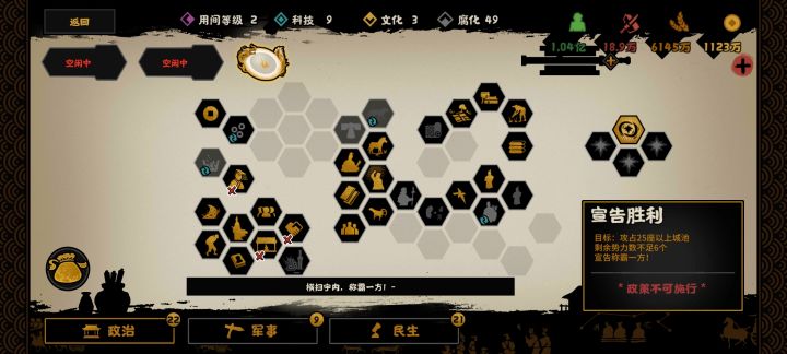 清魏晋南北朝太影响体验了,每次结束都要准备好卡牌,就最简单的衣冠南渡都恶心我好几轮结束。结局能不能条件设立简单点,每次用卡前都还要算下够不够,官僚还有生命谁没事就去关注那个,死了我还得重新安排。我不是刻意要玩速通,但是无聊的情节不是影响人体验吗,该结束就结束啊。魏晋南北朝就是全局被牵着鼻子走每一条路都给你定死了,要看到终点的时候告诉你路上东西没拿。还有子弟兵能不能通过预留的方式增强一下名臣,有