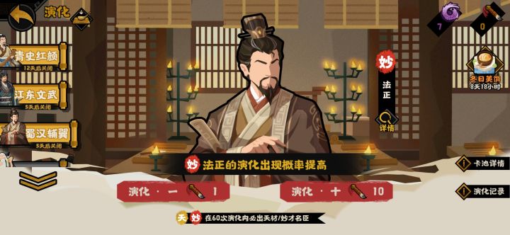 个人建议:可以每个池子有专属的演化之路,120抽或180抽的奖励可以改成该池子名臣信物,相当于大保底(仅限天妙)时代卡池可以180抽演化之路奖励自选该时代天级名臣(仅限池子里的,可以补一下没抽到的,当初三国池子我就是其他天级抽到两三次硬是没抽到二荀和张辽)