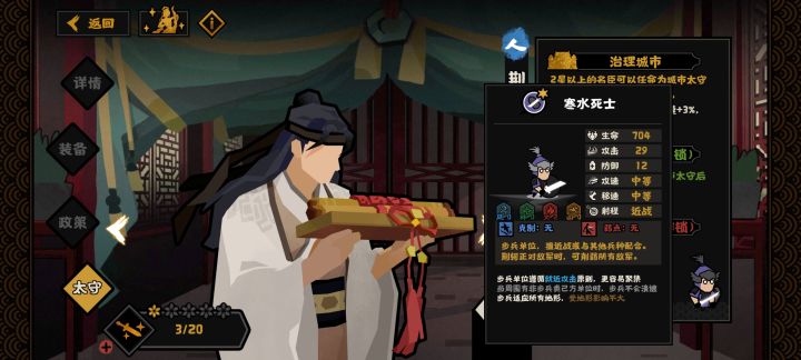 能不能出个武将上战场,这样全是兵挺单调的,打久了就疲倦了,建议出个武将上阵和单挑,虽然是小说才有的武将对决单挑但是这样增加了游戏趣味性,可以出个触发单挑的模式,败者对面出现小规模溃败百分之3—5就行了不要太多。武将不要模型不要做的太大,比小兵大一点点就行了,不然看着很不和谐,武将可以有一到两个技能格子,武将3~4个技能,选择一个带上场,技能不要太逆天,影响战斗格局加百分之5~10就差不多了。这样可玩性大大的跨越几个台阶。比如武将两个技能位置,三个天赋技能,选择性如内政,战斗天赋,有选择性,武将政策技能不必多说,战场技能比如统帅技能加攻击,增加前队防御,或者技能,践踏,击退,击晕,范围攻击单体攻击,一场战斗最多触发1—2次。希望游戏越做越好。😁