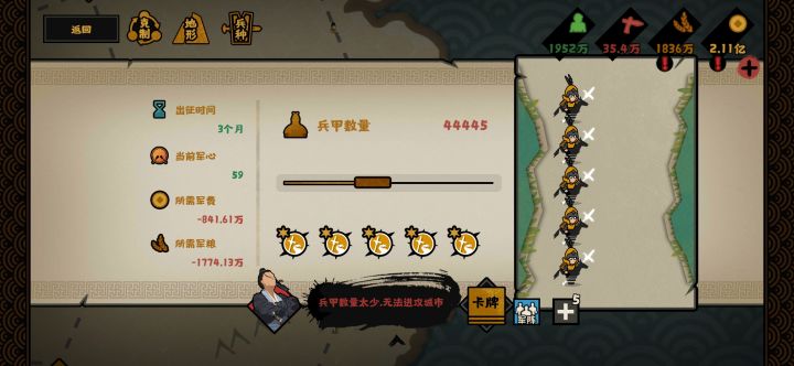 开了几局了,有些话不吐不快:1.单骑破营一直没打过2.城市据点的发现机制到底是什么?为什么有的据点就一直不出现?强迫症看了多难受!而且有的类型建筑一直不出被卡资源了政策都点不下去。3.武将固定了兵种为什么不能换?军团人员固定了也不能换?军团兵力和总兵力为什么要分开算?军团凭什么不能攻城?