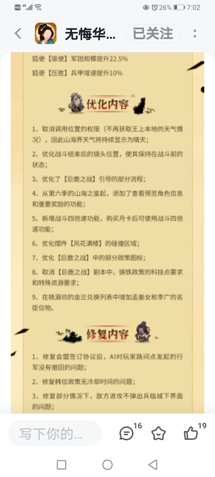 还有优化内容第五条,越看越不舒服,还有上次的付费解锁主线剧本修复内容第二条与第11条第二条:这次韩信的加强只能说是弥补了这个bug,上次我也建议过了,明明可以直接不用管,不需要加强韩信这样也很强了(后期),这样只是增强了前期开荒,后期行军照样慢(要是按照以前的五分钟),除非给他改成一匹马或者减三分钟的冷却。第11条:匈奴bug一样,明明可以整活,玩的很开心,也可以算是一个彩蛋,但偏偏要把它修