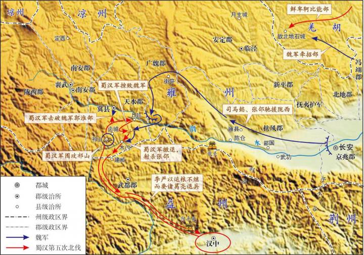 亮围祁山,招鲜卑轲比能,比能等至故北地石城以应亮。因为太短蜀汉和轲比能一起出兵,好像没人注意,鲜卑在里面很重要。鲜卑在北方牵制了魏国兵力,加上吴国,魏国被迫三线作战,鉴于蜀汉国小力弱而时不我待,灭魏分出阶段与步骤;在现阶段,南面结孙权为“掎角之援”,西面则以“西和诸戎”的政策策略,联络动员陇西诸胡,后更延伸到塞北的鲜卑轲比能,以期对曹魏形成合围之势;蜀汉的北伐大军,则从陇西向关中、中原挺进,以期最终“还于旧都”。