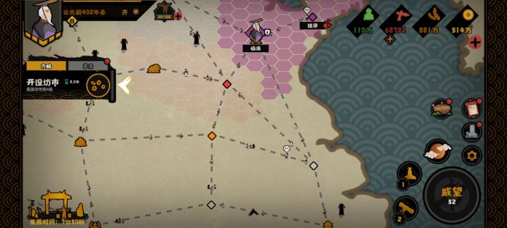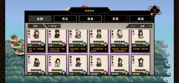 第六篇(政治篇)分析的名臣有:管仲、妲己、女艾、豢龙、张仪、妺喜、班超。管仲:三技能名臣一技能——专山海之利:20%金钱产量,无特殊资源消耗,5分钟。二技能——尊王攘夷:攻打威望<50的国家可用卡牌尊王攘夷,3高级生物资源,10分钟。三技能——货币谋国:5%金钱产量,用间“货币谋国”(国家民心-10,2年内钱粮产量-12%),无特殊资源消耗,3分钟。管仲,辅佐齐桓公成为春秋五霸之首。对内