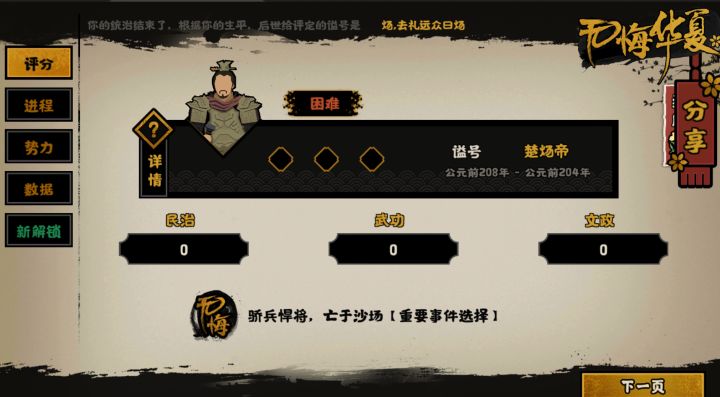 【达成条件】:东郡:民心0军心100腐化100威望0且国家全局民心0军心100腐化100威望0携带名臣:民生——钟无艳—诤言——加军心降威望军事——孙膑——掌军——加军心加腐化政治——妹喜——红颜——加腐化降民心贤者——韩非——刑名——降民心加威望会稽、东海包括后面东郡全部建商贸产业,妹喜任太守,商贸产业三级可以全势力降低5点民心开局依次点妹喜红颜,诤言,掌军(红颜冷却时间长所以先点