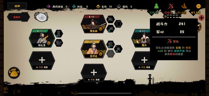 由于陶弘景的机制可以使循环技的数值叠加,所以开局可以先点出祖冲之的缀数,然后叠加2-4次(非循环限制副本2次,限制循环副本3-4次)乘胜,霍光还可以抹去特资消耗,相当于点循环技不消耗特资。 优点:开局可以点出200-400的战力,可以快速打出去,并且奔袭可以抢钱粮可以勉强续航 缺点:循环技限制副本需要尽快灭国才可以续上奔袭,不然会导致后继无力的情况出现
