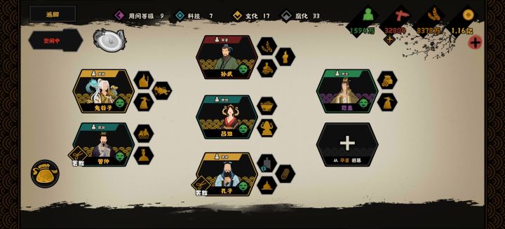 一.名臣 可以选个曹操势力名臣带比干,孙武,庄子,商鞅,后期能达到满民心,满威望,高军心,高战力。