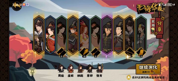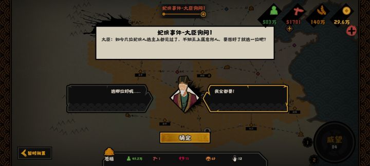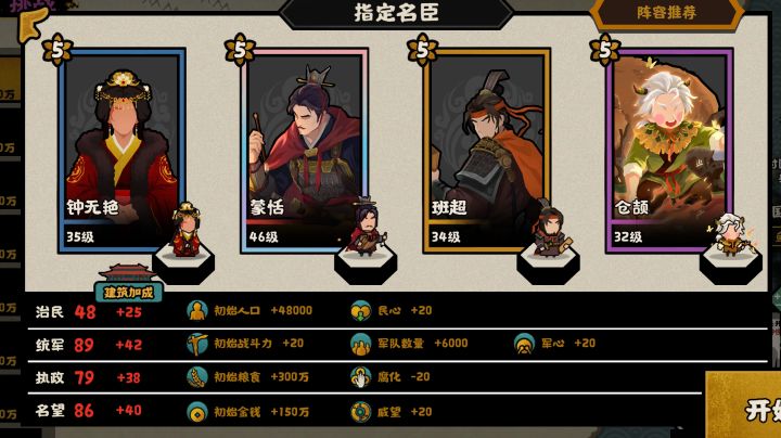 阵容如下,望舒(硬绑定)妇好可换霍去病或者甘宁,如果换其他名臣但是不会那么轻松,贾诩(软绑定)可换寒浞周公妲己,推荐贾诩有乱舞就开,加速其他势力灭亡速度,还能加军规,这样一算收益很高,贤者只能硬绑定老子或者孔子(优先老子)开始全部跟史实走剧情就可以了反正灭一个国就去把望舒加战力的点上乱舞一开就看戏。走完剧情稳定600+战力,不缺钱粮打的还舒服,也是很推荐大家去体验一下。不太明白的详情可以看我b站