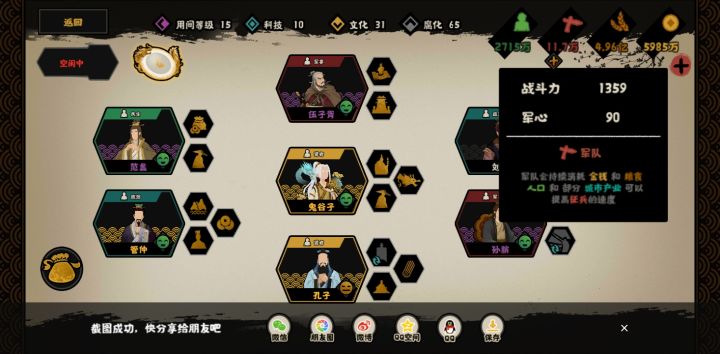 第一套是精兵流国家队,战力全程都高,威望民心军心后期90+以上,打完总分非常高。羲和加经济和战力,孙武加战力和掠夺威望,商鞅加战力和掠夺军心,老子加战力和掠夺民心,而且羲和商鞅老子都是可以重复刷技能,每局都可以拿满8碎片。到结束的时候战力上千很容易,除了反复刷民心和腐化费点时间,总体没啥缺点,可以说非常好用和万能的国家队了。第二套潜谋流国家队,核心是鬼谷子,高用间前提下,30威望潜谋一个城,不