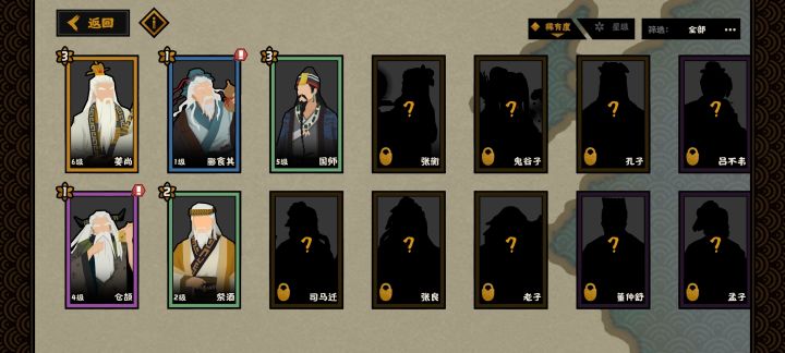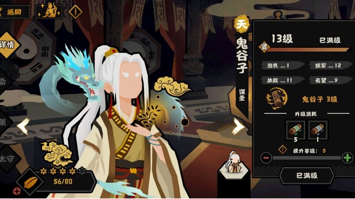 用间折磨流是以用间为核心的一套娱乐流派。那何为折磨呢?因为这套打法需要耗费大量的时间与精力,所以非常折磨人(其实也挺折磨AI的),感兴趣的人可以试一试,或许能发现不一样的风彩。名臣搭配民生∶范蠡 军事∶由于并非核心,故最后再谈。政治∶张仪 贤者∶鬼谷子(我的鬼谷子是一片一片刷出来的,没有抽到过,故还未没满星) 打法介绍∶前期∶利用鬼谷子和范蠡的太守治理快速增加全图国家好感,然后进行联
