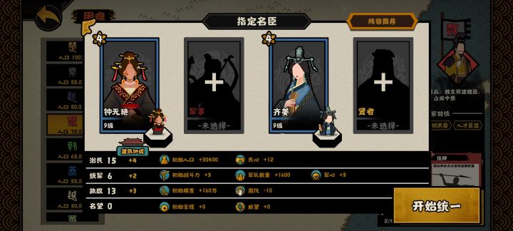 大汉本已经出来有一段时间了,不知道大家的游戏体验如何呢?在一开始的摸索下我也是玩了好几次才通,而且通的还是最简单的结局成就:汉匈和亲。但是在这段时间,我发现了一个较为好用的平民阵容,对新手来说非常友好(我的攻略都是以挑战模式为准的,相信大家应该更喜欢带金边的结局吧🙊) 就这么一套,低军心低腐化高威望凑会盟流派,随着版本的更新,数值已经不会被锁定了,所以比干庄子流想用还得看速度,并且现在士气也会有