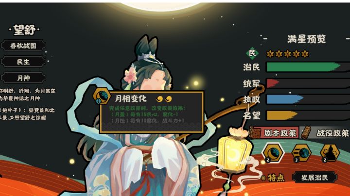结论:望舒对得起天级的身份,实际使用并没有看上去那么不堪。削腐:仅一个民位可以即可实现低腐败与高民心状态,解放政贤。高腐:提供大量的原始战力,且可以吃战力加成。发育:与伯牙子期流水配合,挂太守升级渔场,七国之乱高光。功能:高腐败加战力高民心削腐败蚊子腿般技能发展收益,还扎手采闻流插件&太守真发展收益适配高腐败流:高腐败转战力高民心流:高民心削腐败低腐败流:民位削腐