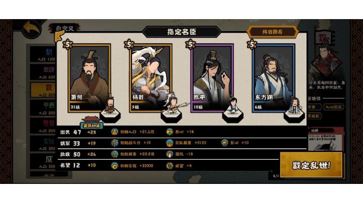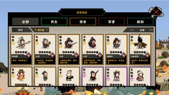 民生萧何,军事杨戬,内政陈平,贤者东方朔萧何抚民军队数量达到10万时金钱、粮食产量提升30%守国防守胜利时,获得20000军队(根据所处时代数值会对应调整)举士可招募其他国家领土上的名臣主要功能是配合陈平获得军队也是可以让你在任何国家都可以获得。冯异耿弇杨戬劈山战斗力提升40我军轻骑不受山林影响粮食消耗大幅提升天目可查看所有政策信息所有城市信息度提高40用间等级+