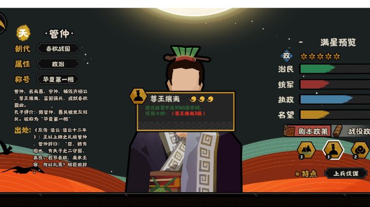 管仲,作为政治名臣,却能提供强力的战斗卡牌。不过,想要使用这张卡牌,就需要敌国威望低,这就十分的被动。在不靠其他名臣的情况下,就只有会盟这一种手段,要么自己会盟,打压他国威望,要么搅黄他国会盟,手段十分有限。那加上名臣呢?一般人会想到一个人人都有的天级——孙武,他的风林火山能夺取他国威望。不过,这就有个问题,你要先胜利才能夺威望,万一你正好缺了这张卡就赢不了咋办,这又是一个死循环。 那么,有没有
