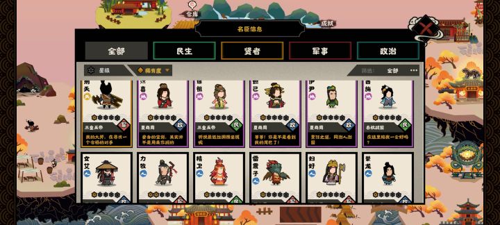 l 本评测为新手向,仅针对常规玩法并且对于道具使用考虑较少。速通玩法和老手应该都有自己的理解,看个乐就行了,不要太较真。l 数据部分参考无悔华夏bwiki站。l 名臣评测主要考虑名臣政策,对于获得难度,太守技能,家仆强度,战役政策,名臣属性加成考虑较少,因此并不全面。l 主要针对5星名臣进行评测,对于某些1星和5星差距巨大的名臣仍然会以5星实用性为准。1. 羲和:5星可以说是泛用性最强的