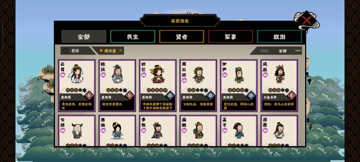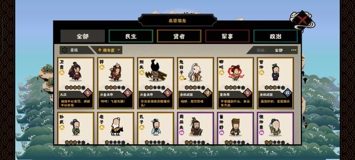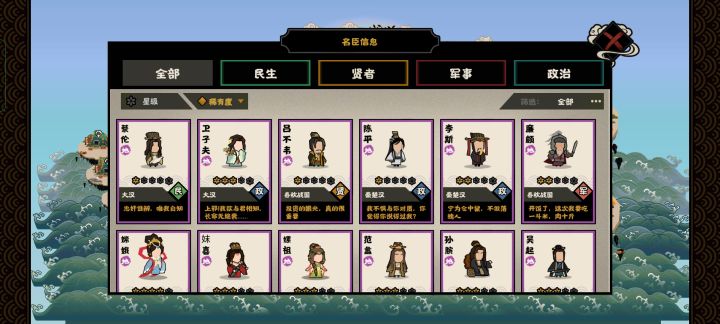 对于名臣搭配分类,我建议是按同类型下的(同类型的意思是……比如,高民心限制条件的名臣和提升民心的名臣是同一类型。)。像孙武这种也算高威望循环名臣哦下面是我的整理归纳:1,循环行动力民生:张骞2,威望类高威望的限制名臣:民生——范蠡,贤者——鬼谷子配套循环名臣:民生——张骞军事—— 廉颇,白起,孙武政治 ——妹喜,妲己,周公贤者 ——韩非子、丽食其、吕不韦、董仲舒(一次费3点文