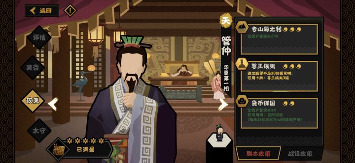 开局点尽快扁鹊与白起政策,安排治理城市。有白城打白城,有不接壤的城市也打,再打只有一城的势力。然后点李斯的两个政策,开始灭国。之后点庄子的循环政策。