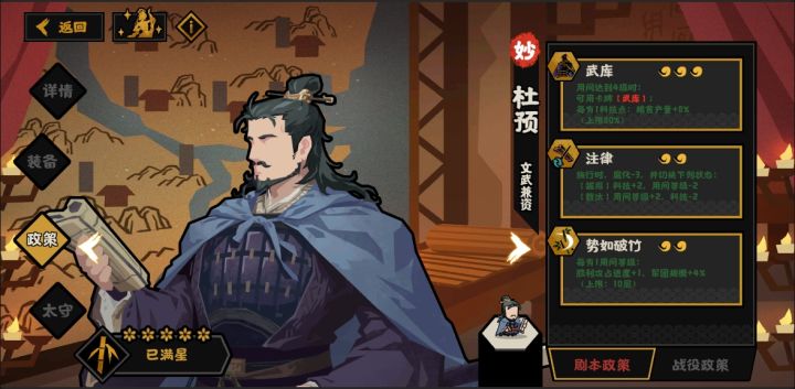 写在前面:新的飞行棋和淝水之战就要来啦~因为妙级卡池名臣目前没办法歪出来,也没有肝的途径,同时还有山海巡查使活动,总的来说还是推荐大家抽的。(当然,更建议大家抽个胚子,毕竟同期也会开放王猛、卢植卡池之类的,如果有需要也可以抽取其他名臣的胚子) 如果觉得麻烦也可以直接看最后的总结~一.名臣政策①武库挺有意思的设计,少有的关联用间等级与科技的设置。因为政策具有一定的强度,所以需要少量的特殊