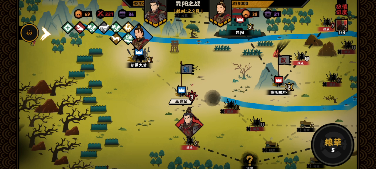 在山林据点升3级后,点一些加战力的政策,只要能打过敌人没多少战损就无脑横推了(我升了两个3级的山林,不知道有用没)累战的神,兵越打越多,飞雷神推荐把首都周围的城不用累战进攻,差最后一次就能占领的时候把兵派过去围着城,想打的时候就飞过来打掉占领,可以省行动力(派了兵去打据点马上就飞去新城的话,去打据点的兵会直接消失)