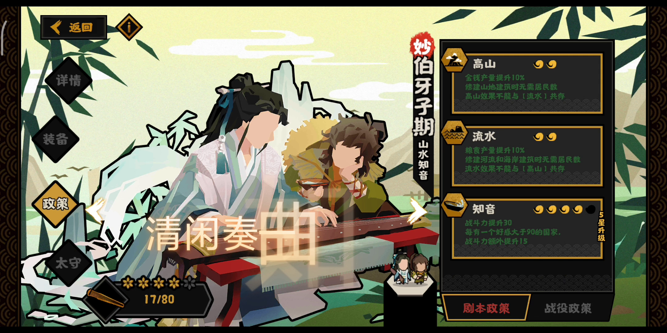 前情提要:本流派娱乐为主,不适合速刷,需要频繁刷档。主要乐趣就潜谋带来的快乐。毕竟读书人的事情不能叫偷,那是潜谋。 名臣搭配:范蠡,廉颇,班超,鬼谷 核心是鬼谷。其中范蠡、鬼谷提供4点用间,廉颇提供威望,班超是我打西域用的,如果不想肝西域,这个位置你也可以随意替换。开局先把政策裡几个用间的点出来,因为匈奴开局9用间,比较难。招募尽量找威望的名臣,这里我招的是董仲舒和东方朔,刷威望快一点。差不多一次会盟可以刷两次潜谋。当然,我还留了一个给张汤。就想试试技能。 我的想法是要先趁匈奴还没占领关隘之前,把地给潜谋过来,然后慢慢肝西域,等和亲任务做差不多了就决战。
