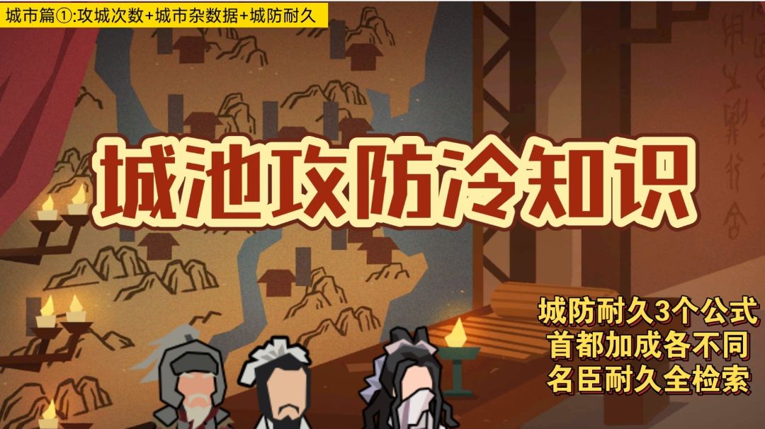 【省流助手】 1.城池耐久公式 ①三皇五帝城池耐久=5+5×城市等级 ②夏商周城池耐久=10+5×城市等级 ③春秋战国,秦楚汉,大汉=10×城市等级 2.攻城进度=名臣加成+5×(1+连通道路数+连胜次数+攻城武器数-防御武器数) 3.城池耐久科技:三家分晋,夏商周,春秋战国,秦楚汉都有城池耐久互动科技 4.城池耐久名臣互动:墨子,孟姜女一次性技能可以提升城池耐久,孟姜女多次技能可以降低城防,孟姜女,墨子,廉颇太守技能可以提升城池耐久