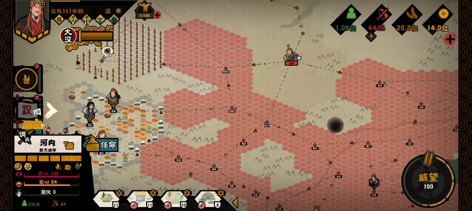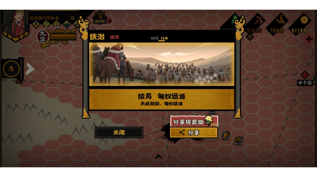 前期在靠工程机械,占领关键点,把匈奴打成飞地,慢慢收地,有钱有兵。因为飞地他没法补兵,累战到最后一次停下,再次出征。
