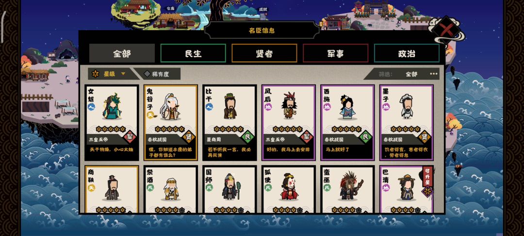 我是一个开服就玩的闲鱼玩家,时间会沉淀你的技巧,这个非常的简单,不要焦虑,你基本上不会做错什么事情。 个人来讲:进入游戏,你会获得一些奖励,你不要太焦急的去抽奖,或者是非常难受的去思考抽哪个池子,因为刚进游戏的你,是要体验各种游戏玩法,了解各种规则的。 这个游戏有难度设置,你看到了吧,你可以在副本里招募到名臣,名臣会有出现的地点和时间的表格,场上容纳的可招募名臣,最多不会超过四人,你想招募名臣时可能会因为被卡在系统排队里或者因为某些数值要求而没有看见他,不要着急,攻略不多,可以慢慢找。 若非要推荐的话,[新手登录]的孙武,[三皇五帝]的羲和,[夏商周]的姜尚,[春秋战国]的商鞅。你可以快速体验这些副本的普通难度,打满好感度,迅速白嫖到手,仅需要3天。这四名角色非常的强力,适应性强,自成体系,可以拿来伴随你各种开荒成长。 品质低的名臣,我还是不推荐吧。我知道有一个女刺客会让你速通三皇,也知道有一个女将军成本低战斗力又强,也不曾忘记有两个老头子可以刷很多金币。可是游戏初期就是要获得珍贵的名臣和打最高的星级,星级解锁不了最佳国家,体验会很差。 大小月卡和直充系统完全没有必要,抽奖仅供娱乐,没什么价值,小水花罢了。