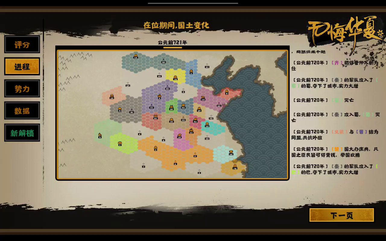 思路就是 参考一位大佬的 消灭所有蛮夷以及反叛周的国家 可以拉秦 晋 燕 齐 周结盟 共伐 自己不打任何城池 保证结局周两座城 比自己多一座 这把只有郑国不臣 但是我刚和齐 秦 晋 周同盟后 想拉燕同盟 燕国直接把齐国和晋国之间白城打下来 这是晋国刚占领的 于是直接盟友与其交恶 好感为零 拉齐晋共伐 打燕 想把地连起来消灭东边的蛮夷 但是燕国爆种 盟友打不过 于是自己出手 占了那座城 于是齐国背盟 主动进攻我打下的城池 这样他就和周解除附属关系 只好灭齐 然后燕进攻我也解除 附属关系 也一起打了 中间宋和鲁国也进攻我打下城池 只好一起消灭 最后我五城 周十城 谈判护佑大周 最好还是别出手打下新城池 如果增加你打下城池周围国家仇恨 他打你就自动解除附属关系 极大增加工作量 判断不臣的标准是 一般是 郑 或 徐 开一次全天下共伐 这样你谁都打得到 然后拉周共伐 每个国家试一下 周拒绝出兵就撤回 必带张良 其他就带加初始好感 西施 张仪之类的