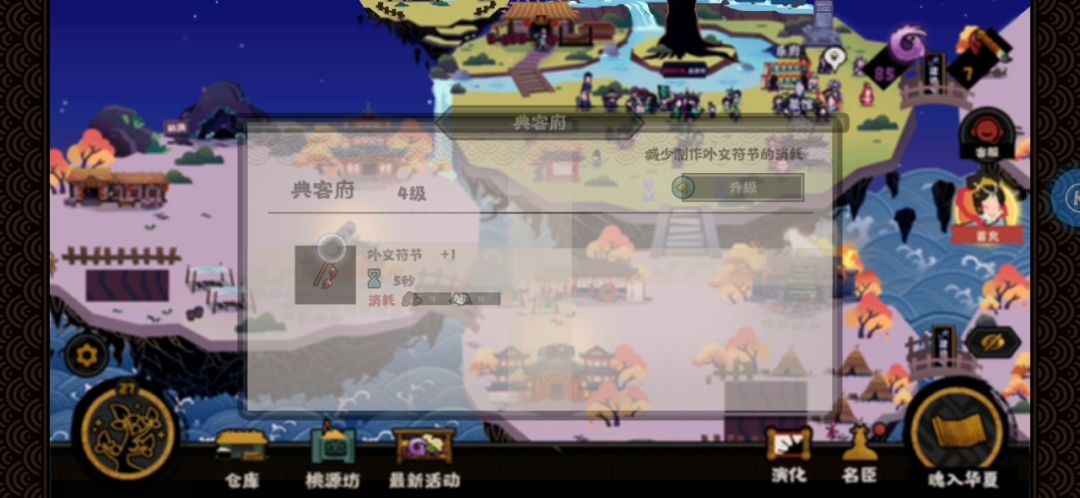 关键词: 新版速刷 四千纹石 不必出兵 可刷碎片 西施不是刚需 可以多送一次礼结束 升级建筑看个人,原意是提升国力保证臣服,但到了结束也没看出国力是个什么算法,理论上可以不升