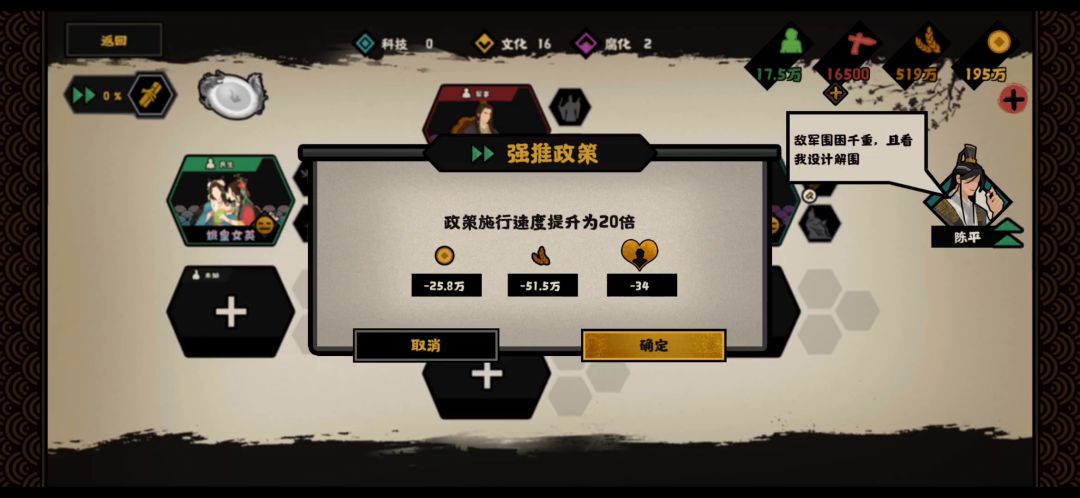 快点进来看兄弟们。晚点就没有了! 现在春秋演义可以速刷纹石。选义渠。开局不开落玉盘把民心搞到0。很快就死。自己去试不到七分钟一把。一小时3-5万石头妥妥的。还有角色经验速刷满级。 bug封了就没了赶紧去刷。。。。。。。 民心政策名臣加速都会减