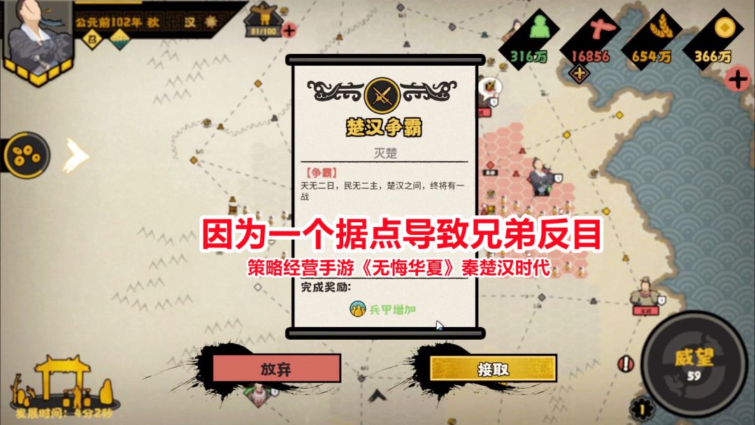 《无悔华夏》是一款多朝代历史题材国家策略模拟手游!无悔华夏手游:因为一个据点导致兄弟反目,楚汉争霸战开启!新游试玩:无悔华夏秦楚汉时代,因为抢占一个据点跟楚国闹翻了!