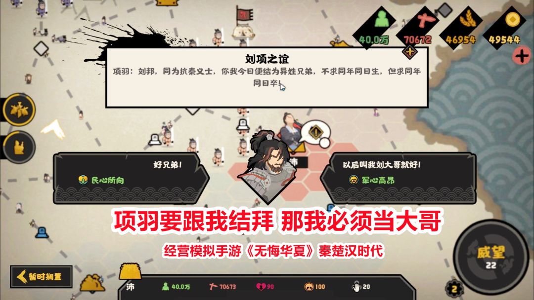 《无悔华夏》是一款多朝代历史题材国家策略模拟手游!无悔华夏:项羽要跟我结拜,那我必须要当大哥!模拟经营手游试玩,新游试玩:无悔华夏秦楚汉时代,跟项羽结拜为兄弟,共同讨伐暴秦