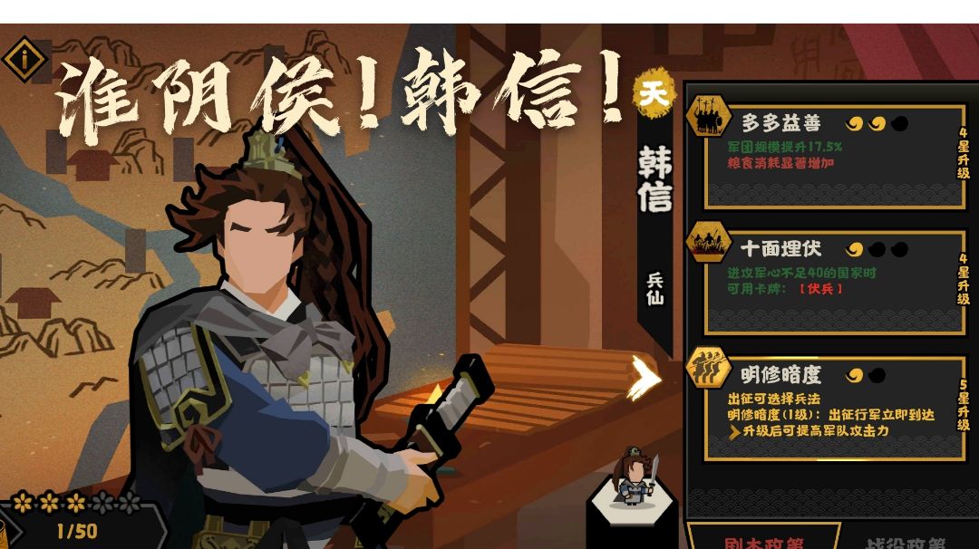 今天把韩信搞到三星了,测了一下三技能,详见视频。 个人感觉,韩信三技能以后是护肝神器,拿到三星韩信,就能体验兵贵神速是什么感觉了,而且五星增加10%战力,更是战无不胜。 三技能无cd(需落玉盘),消耗不高,适合前期在电脑没成长起来的时候灭掉,中期早早结束战斗。 搭配卡牌建议: 一号位:萧何(羲和) 二号位:韩信 三号位:吕雉 四号位:张良(姜尚) 这套阵容打一些特定图或者有联盟国的图,绝对强的一匹。之前我感觉秦楚汉这图,没有强力卡,但是拿到韩信三技能,感觉一切说得通了,放在一起真的能抗能打。 萧何全图招人,出一个收一个,后面用吕雉炒鱿鱼就行,张良配韩信,真正能做到决胜千里之外,战无不胜。 个人见解,试了一下速刷是真的快,欢迎讨论,杠精勿扰。
