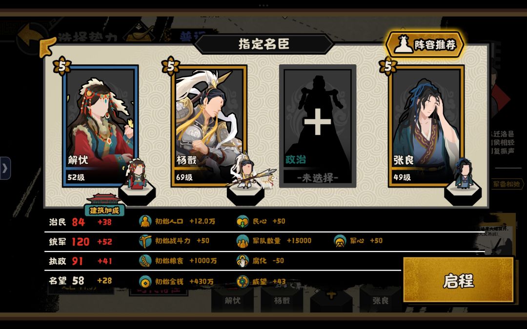 平均7分钟一局,但只能刷政治位,依靠解忧和杨戬确保人机能打过共伐对象。 1.解忧必须出使秦国。秦国能稳定灭掉3个国家。 2.山戎最难打,开局对山戎用间。 3.莱夷和中山实力随机,打不过就用间削实力。 这个操作稳定但无聊,大部分时间其实都在等人机赶路,建议看剧的时候刷[表情_吃瓜] 政治位经验是最难刷的,有经验书全喂政治位比较好。
