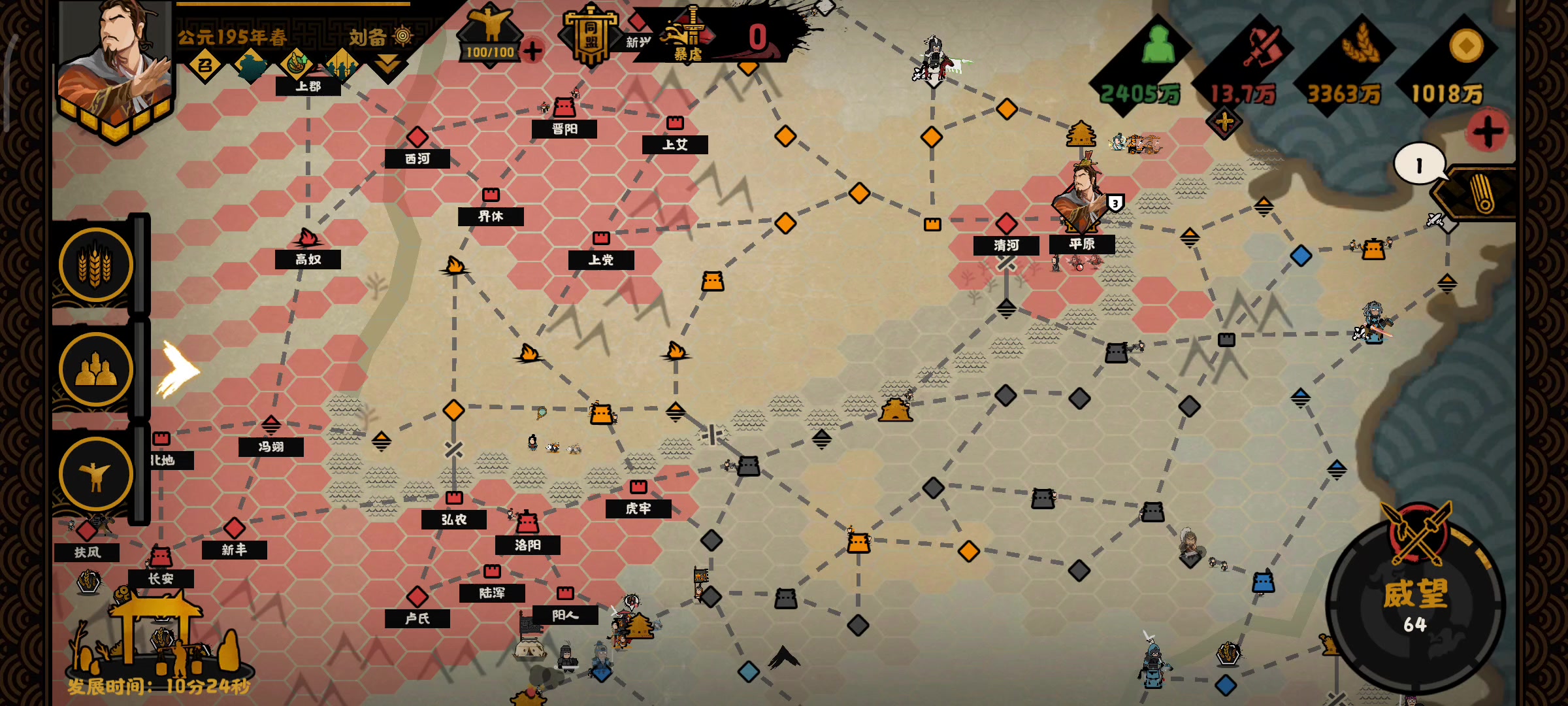 bug发生时间是在今晚更新之后,诸侯讨董剧本董卓方,做完那个需要研发无文五铢的任务点了对应事件之后突然这样的。现在游戏内时间进行的飞快,视频能看出来左下角的发展时间飞速的张以及招募时间飞速的跳,这是能录出来的,实际上政策研发时间以及特资生产时间都飞速的跳,但是拜访用间出征啥的都不动(意思就是我现在没法打架玩不了了),抓紧修啊,打了大半天跳这种bug,要是这个档没法打了我立马删游戏,本来诸侯讨董做的