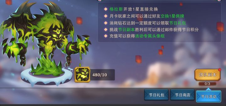 活动时间:2月18日-2月22日活动内容:格拉斯开放契约一星兑换月卡好友之间可以互换1星佣牌开放节日副本、节日商店和节日礼包。充值任意钻石可以解锁活动头像框(由于今年春节在1月份,小年夜头像未加入活动,本次活动为小年夜头像框)限时活动副本开启活动期间团队副本中将开启格拉斯节日副本,玩家可组队挑战这位强大的元素法师,胜利通关可以获得节日积分。(温馨提示:节日副本分为7个固定难度,各位