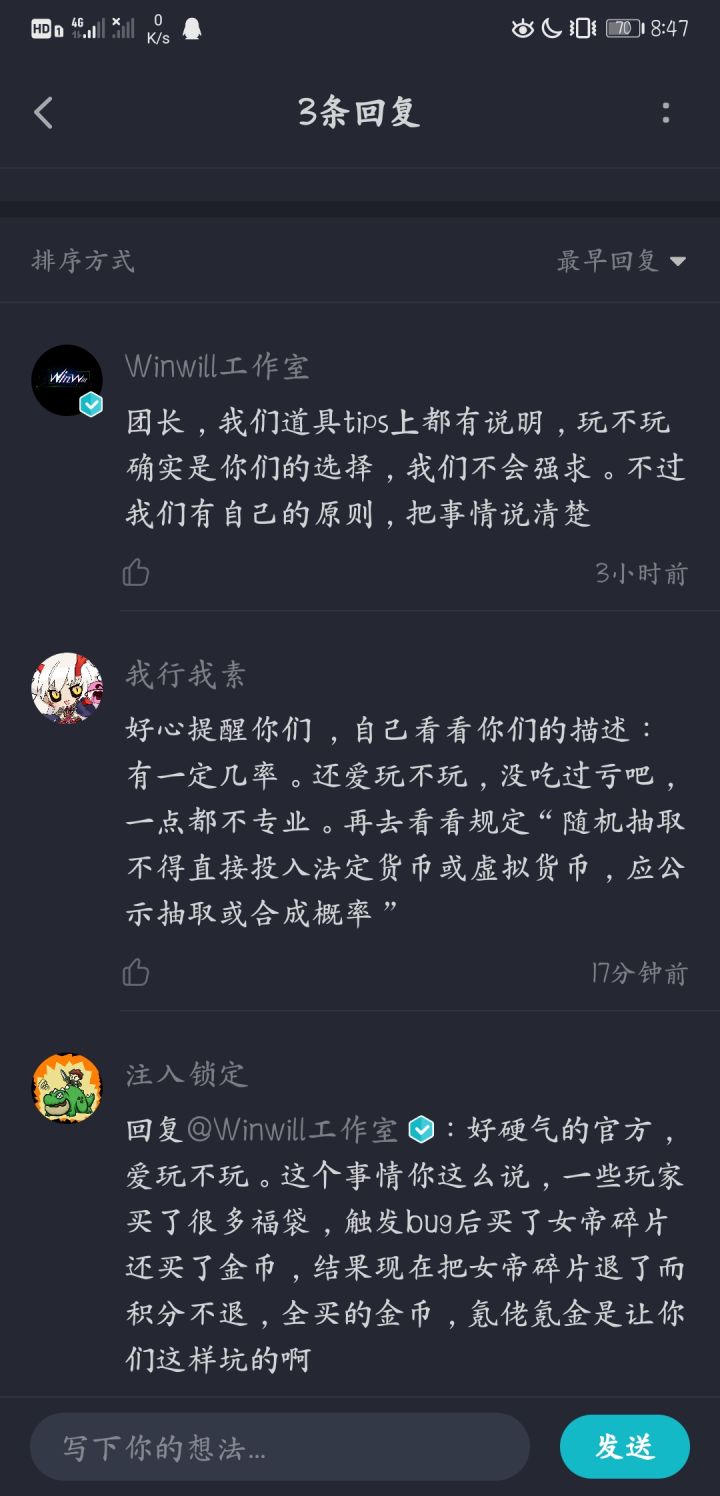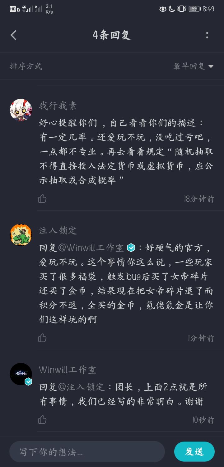 删bug退碎片退积分,很多玩家反映购买金币的那部分积分没退,也就是变成了优先兑换了金币而不是女帝碎片。你们看看官方态度吧