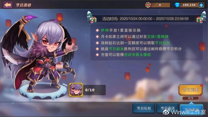 遥知兄弟登高处,遍插茱萸少一人重阳登高赏菊访亲友,塞勒特大陆也迎来老友主教伊神大人来访,送上重阳节考验快一起来看看吧!!!↓↓↓↓↓↓活动详情伊神开放契约一星兑换月卡好友之间可以互换一星佣牌开放节日副本、节日商店和节日礼包。充值可以获得活动专属头像框活动时间:2020年10月24日~2020年10月28日*由于上个版本资源未更新,新的头像会在下个版本更新后显示,活动内充值依旧