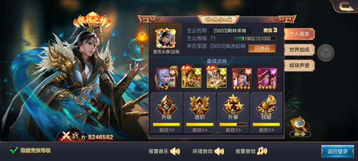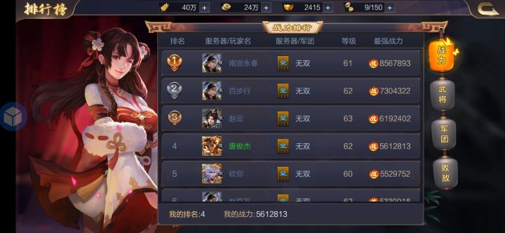 玩了一个月左右,这游戏主要还是存元宝,等出金将抽金将,然后加入一个好团非常重要,因为资源基本在皇团,活动干完了,就得多刷城,战力提升很快的,