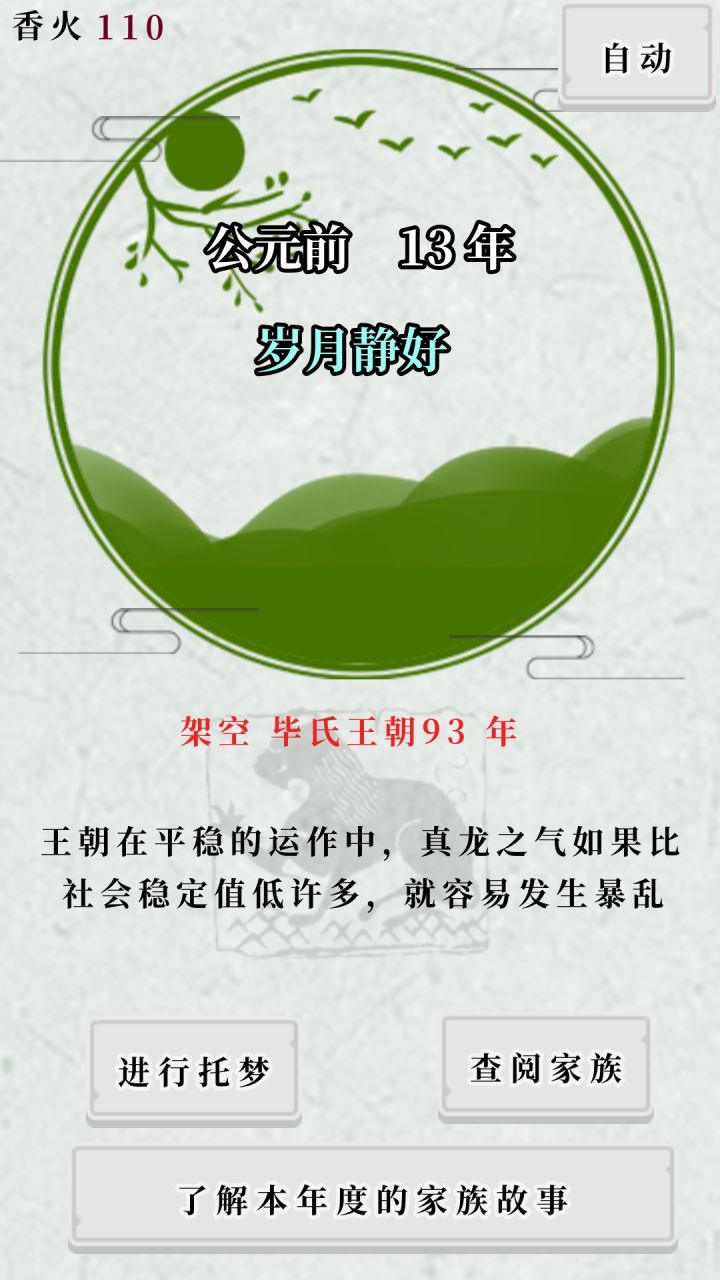 这游戏适合打发时间。我玩了4个小时才结局,游戏内容全部随机,4条香火属性作用不明显,可以随意点。小属性中,爱的作用可以确定是正面的,越多越好。建立王朝之后,各种容易死,没个活过35,搞不好25岁左右就家主了,然后死之前看能否生个子。第一把,仅供参考,不做评价。