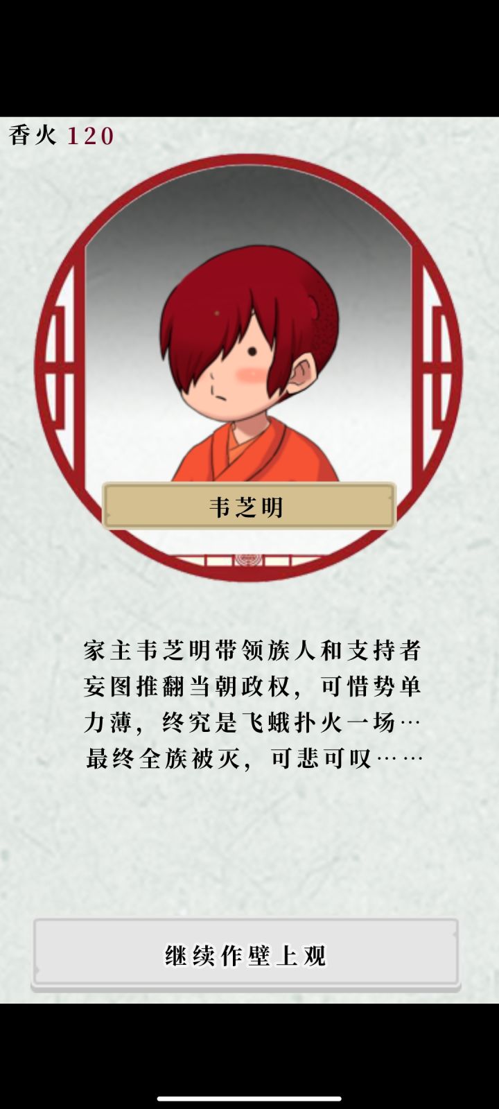 玩了几天,建立了四个家族:姬、裴、颜、姜。第一个家族因为不知道造反是个巨坑,同意家主造反结果被灭了;第二个家族因为有了第一次的经验苟着,(家主问了几次要不要造反我都没同意(╯‵□′)╯︵┻━┻)在我觉得差不多(其实差很多(ー_ー)!!)的时候就同意了,同意完我就觉得这个家族怕是也要玩完,果然不出所料,同样步了上一个家族的后尘╮( ̄▽ ̄")╭第三个家族我就玩了一代便删了,算是没结局;最后的一