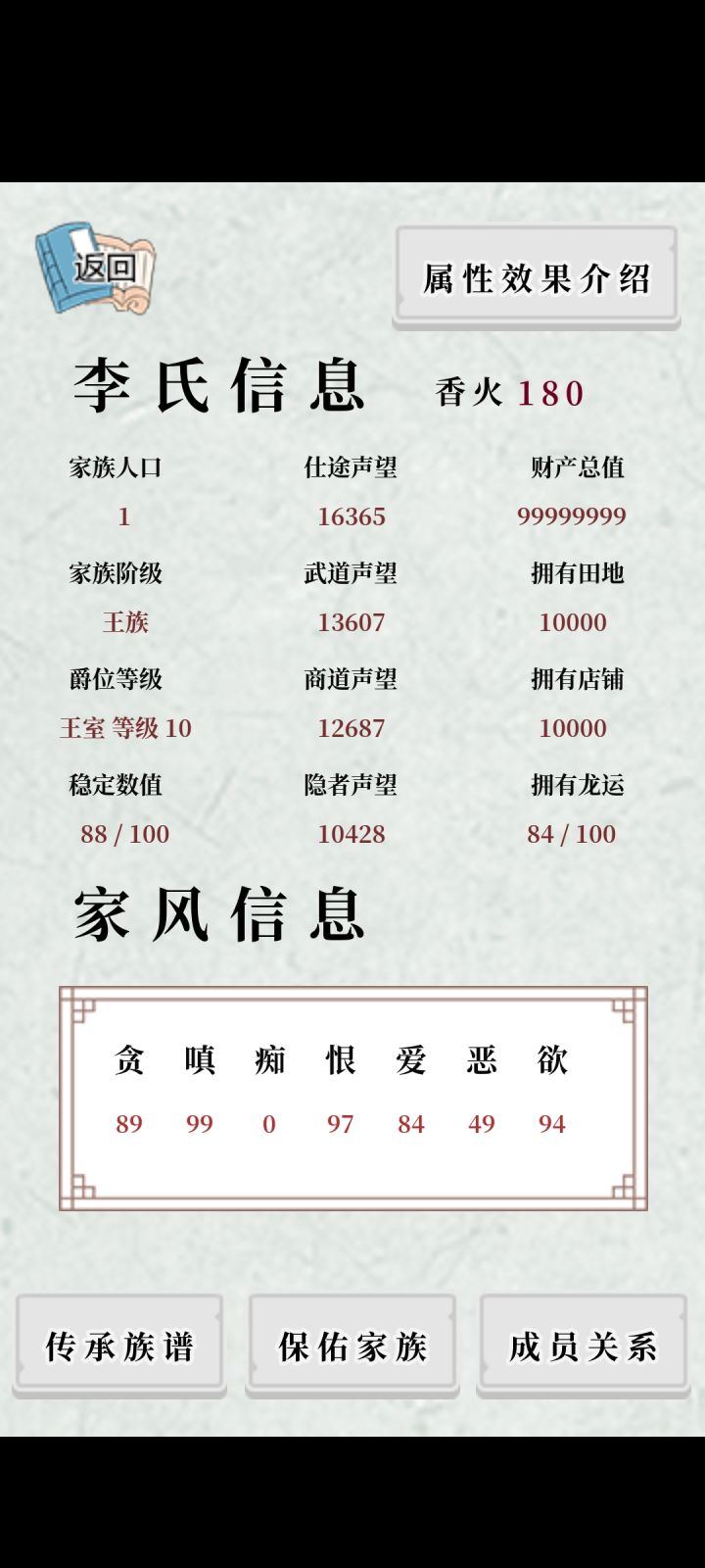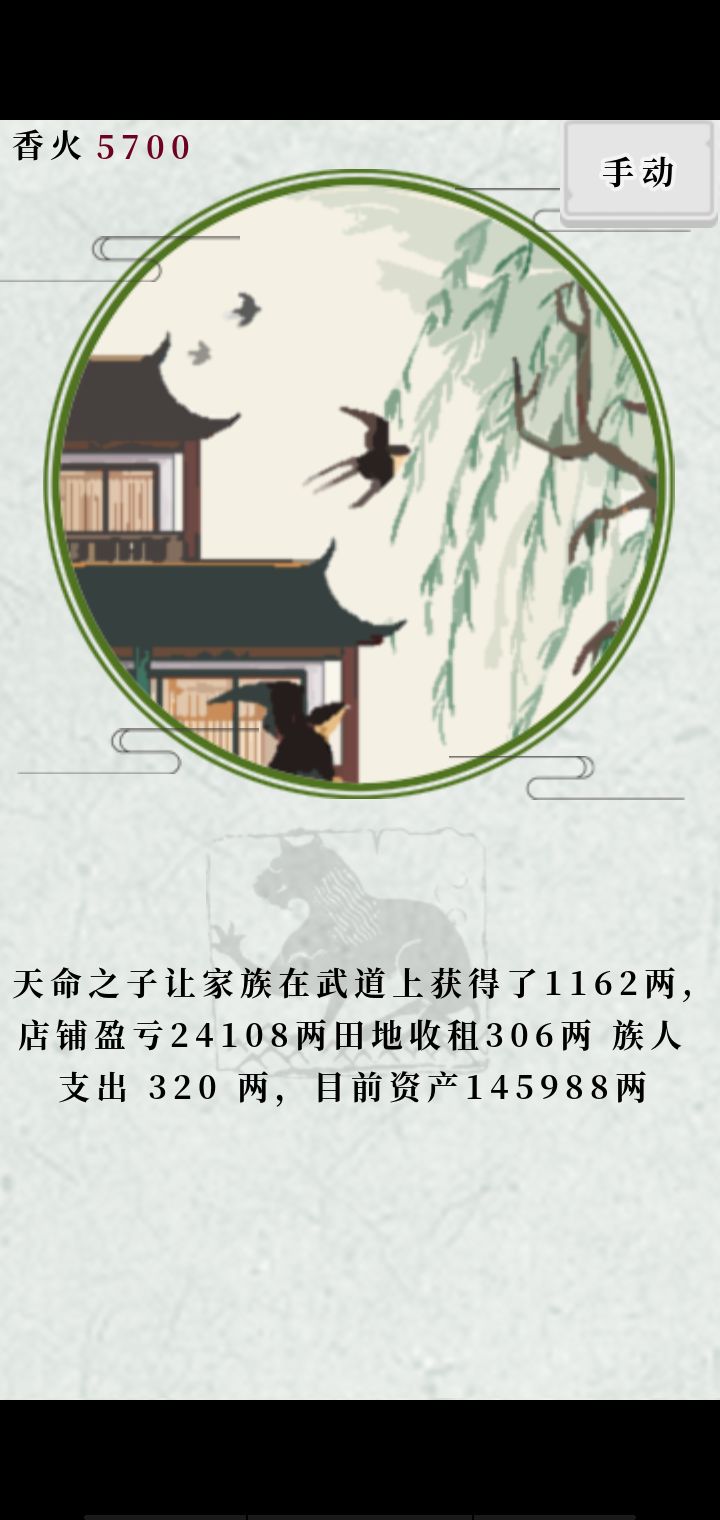 钟姓本家通关~总结一下这个游戏吧:这个游戏其实叫香火保佑,香火最重要,香火最重要,香火最重要。前期就算饿死也要攒够200香火兑换商业声望,托梦都是浮云~后面香火多了就四个全买,但要留下一些香火保证没人传宗接代的时候可以将家族延续下去,前期是1000香火吧后期是我记得就有过一次没人传承扣了我1万多香火。这个游戏告诉我们要记得祭祖啊,不然祖宗拿什么香火保佑我们~还有天命之子啊,要看他爸爸是谁,把他和他