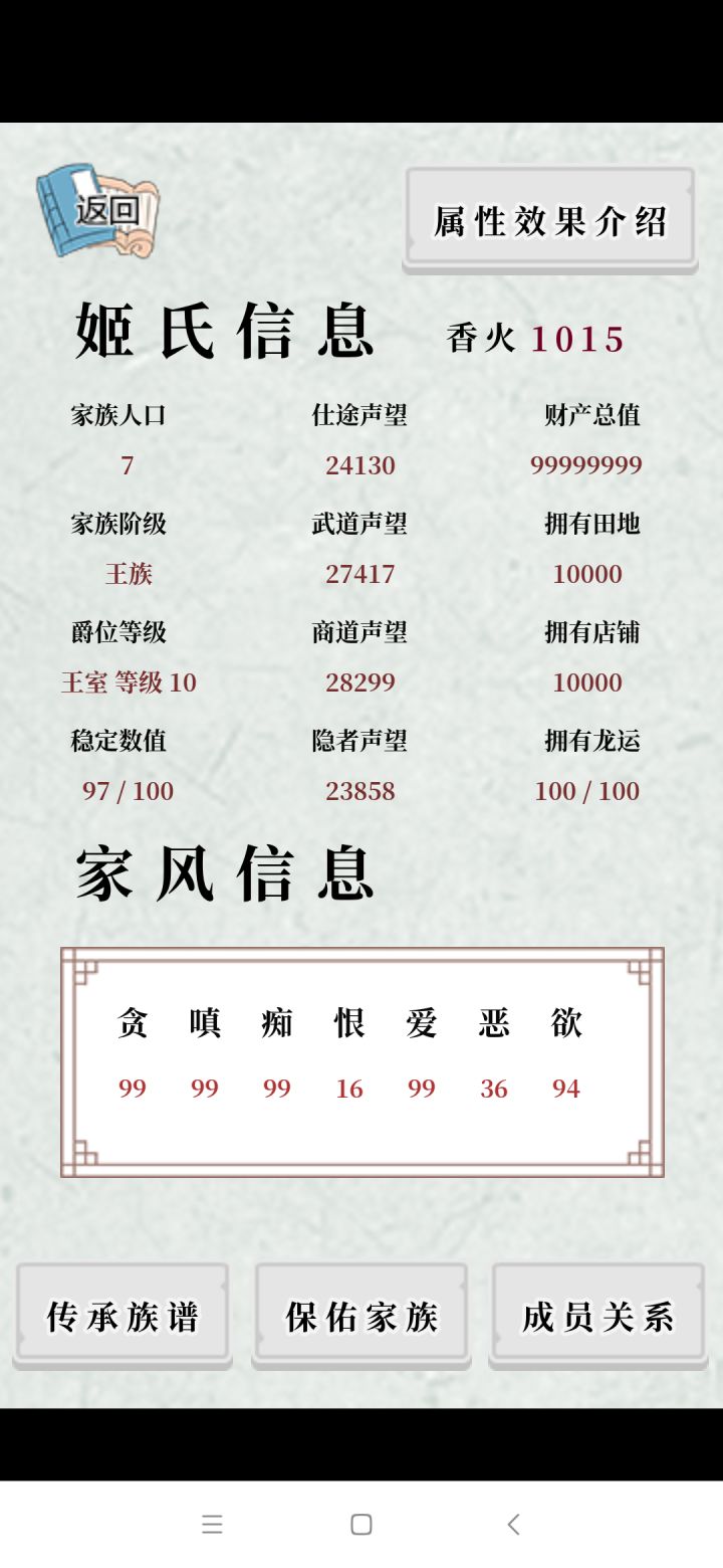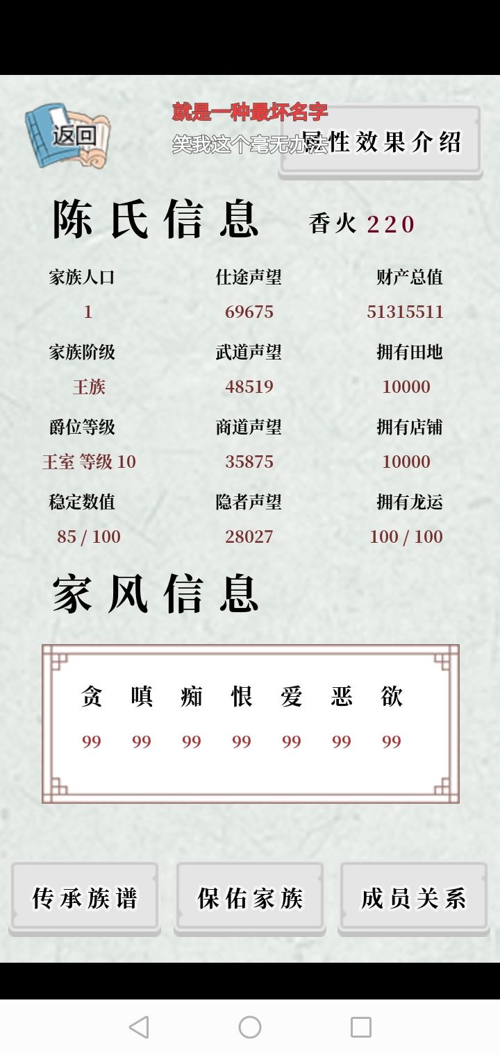 对家族影响最大的一是家风,贪嗔痴恨爱恶欲,是人七情六欲中的七情,通俗来说也就是人的性格,每项数值0到100对应七情,有无数种变化造就各种不同的人,开局选平均,非常稳妥的,家主中庸能延续血脉,子孙多了之后才会有更多的变化(后面保佑会说到的)注意了,古代人平均寿命短,易夭折天灾人祸,生病玩耍,都会导致人丁不旺贪:想要的意思(功=仕途,名=声望,财=钱财,色 =女人)建议保持数值75嗔:理解为怒,生气,