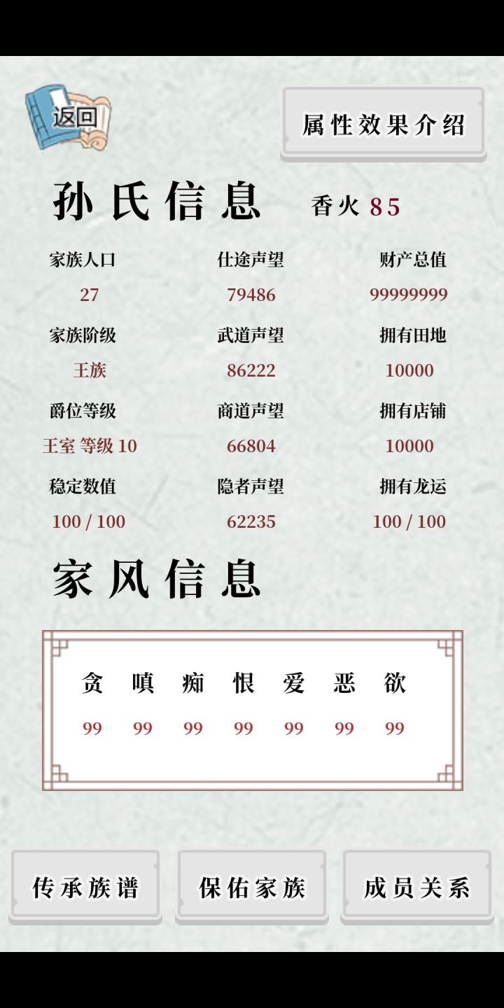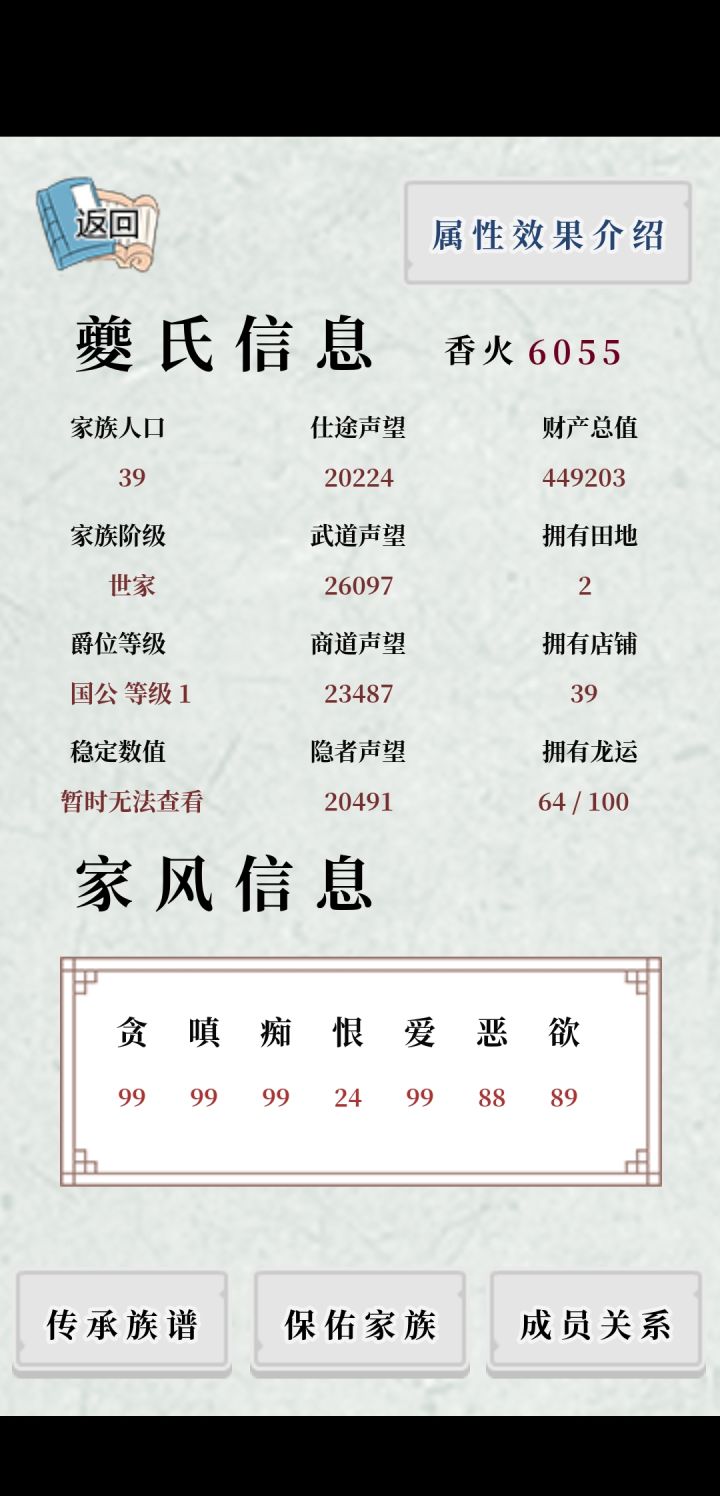 玩了一天大致搞懂了是个随机游戏了前期属性都不用管 保证两个点一 男丁套保佑 二 香火不能断中期 刷香火刷个几千就差不多了 等机会 声望屯到都是三四W 就可以起兵造反了 (交流群里说的大致过9W)怎么造反了?这个就是个讲究人的操作 声望到了以后 开始把 【保佑】 全部套给【天命之子】 刷【龙运】 刷🈵!等游戏跳造反提醒 然后篡位自己如何保证不亡国?分家,保证人口5-8人 保证有直系男丁继