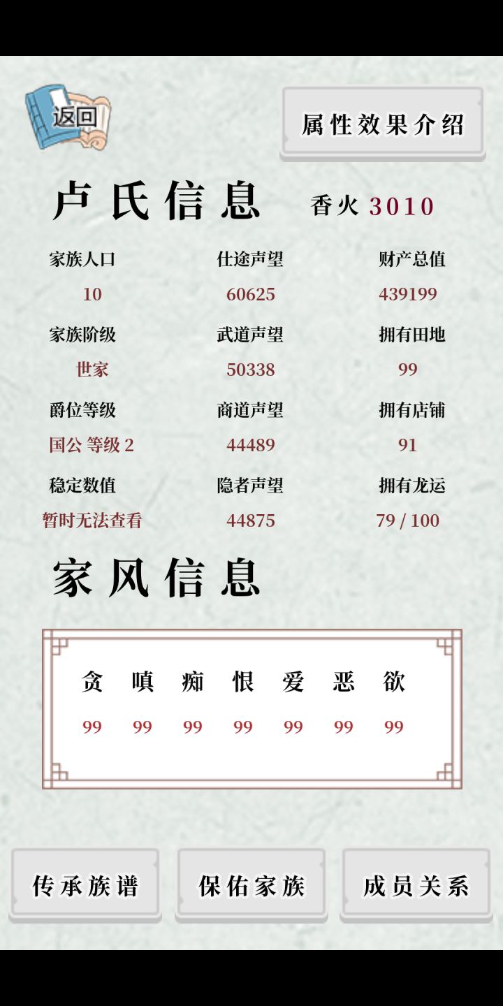 全99这个游戏我有一点小心得吧,家主传男不传女,手上赞1000香火保命,只要不作死基本死不了