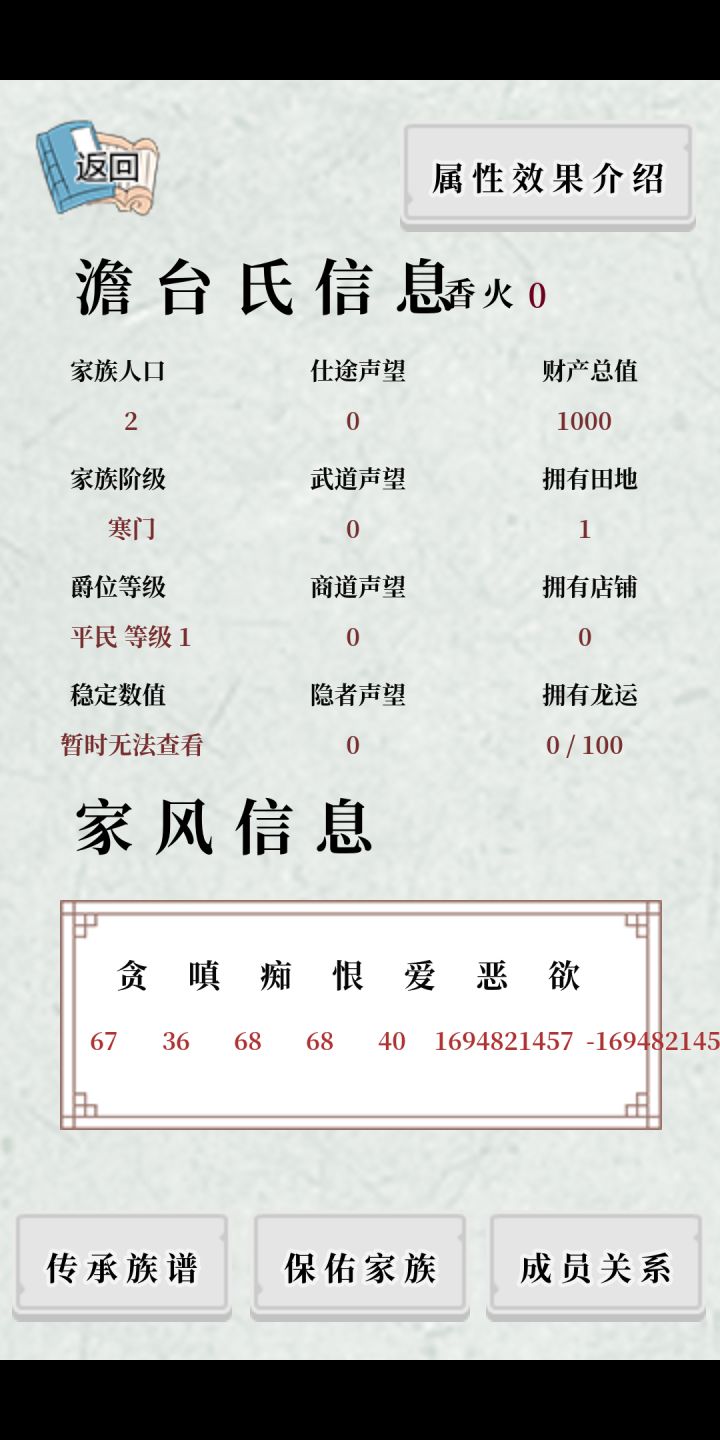 希望选择姓氏可以自定义。希望能改善人物立绘。保佑应该不只是制定继承吧,还得不让他死啊。希望能在购买托梦词的时候显示托梦词效果。希望能在“保佑家族”那里能点击查看家族成员个人信息。