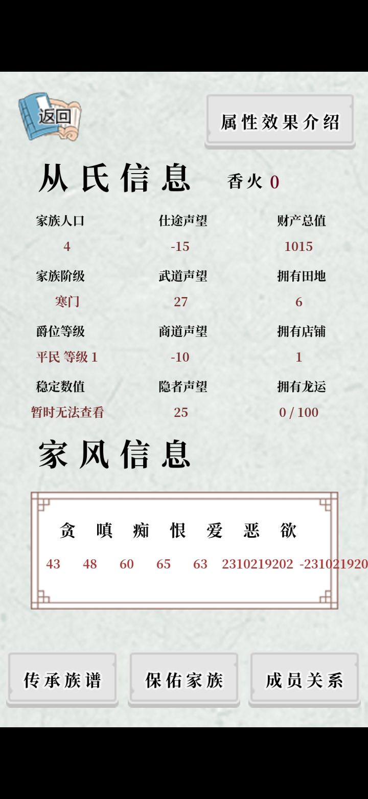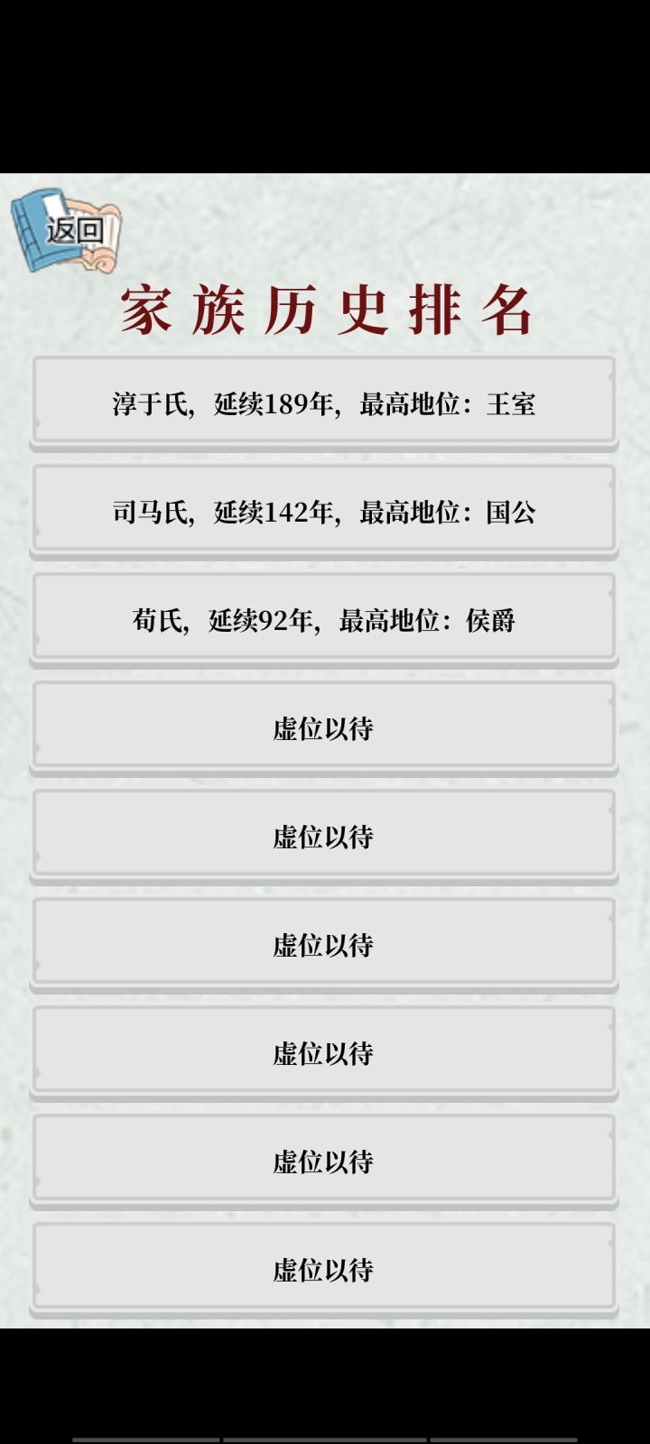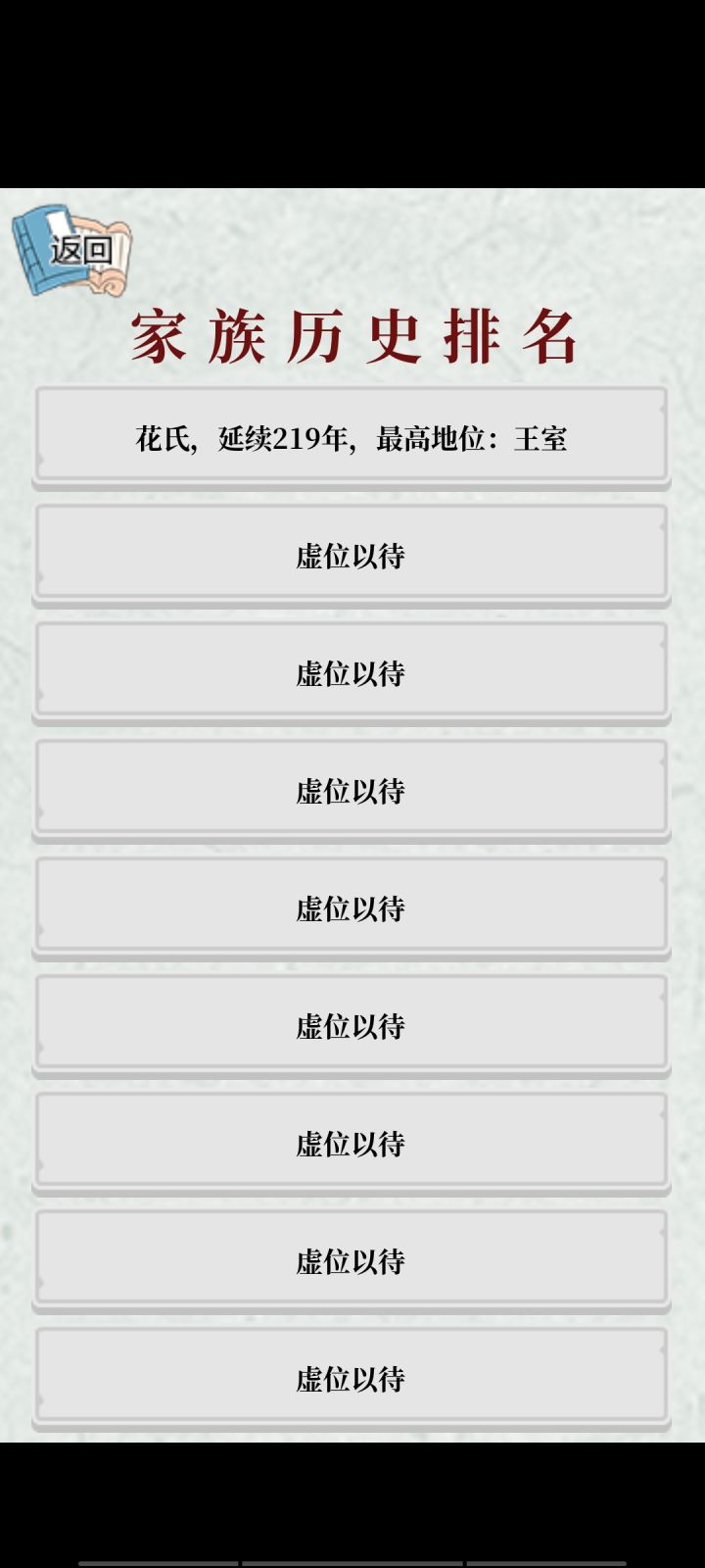 咱不知道是怎么回事。自从建立了新的王朝,前面搞过的家族历史好像都在打仗的时候被咩了一样!!!我。还好我之前截了图和朋友炫耀来着!!请问是bug还是专门的设定?详情见下图(图1是之前的历史榜,图2是新建了一个王朝结束了之后的历史榜😕)