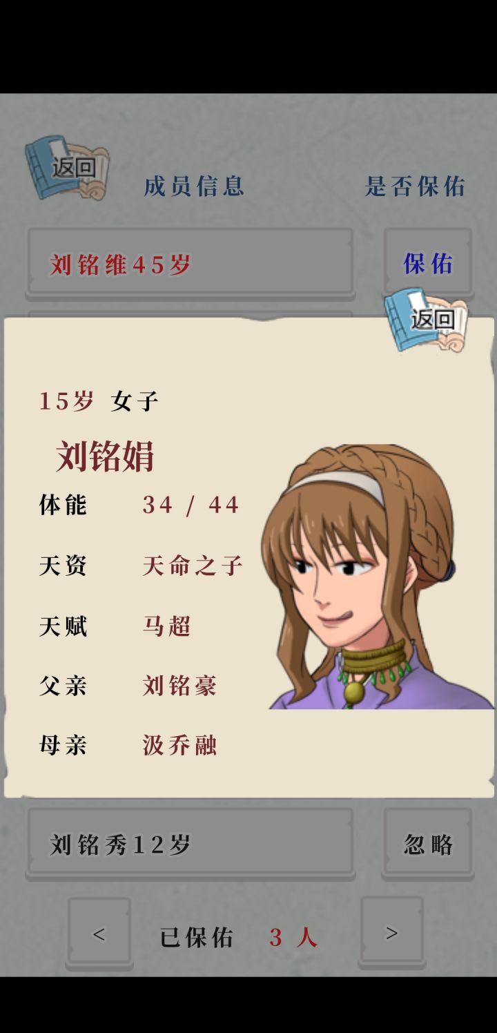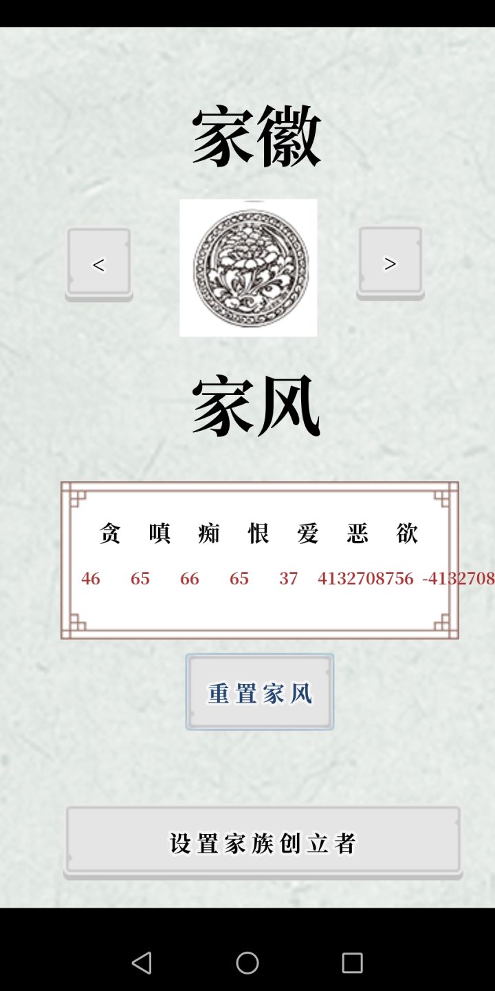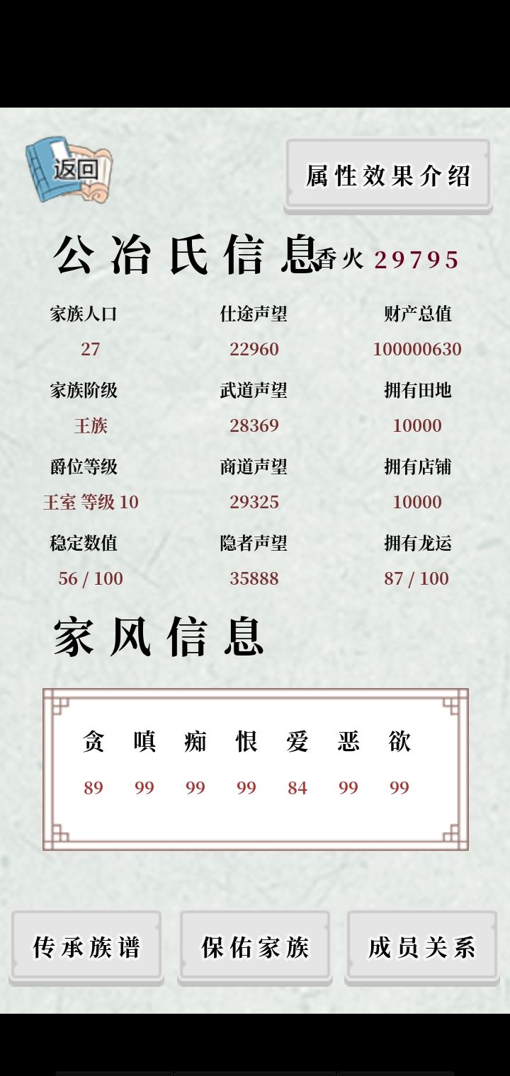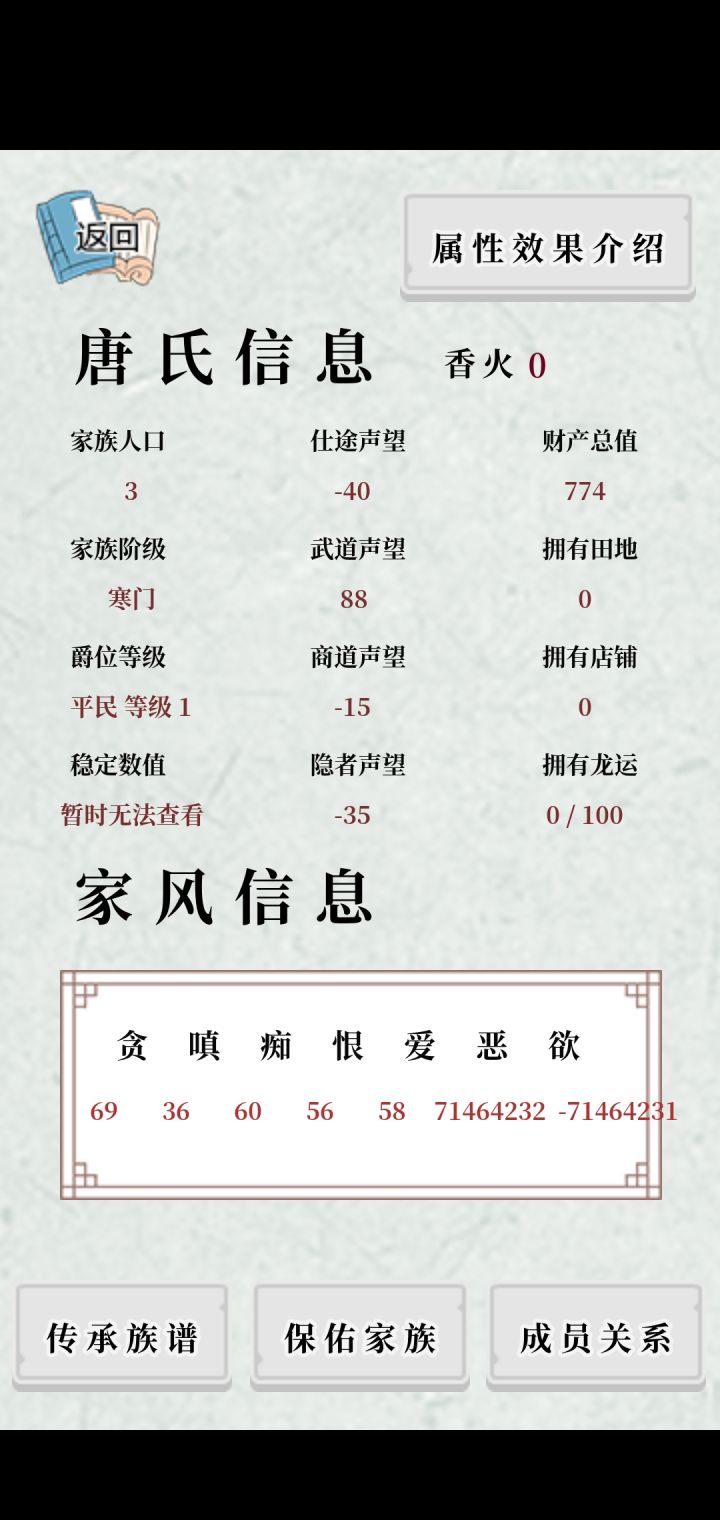 一些影响体验的问题:过回合时,会出现卡顿,点击没反应,过会才会到回合开始页面。手机和模拟器都是如此,家族人口越多越明显。家族里的人,超过64就会集体消失,减到个位数,消失的那些人都还活着,但不在列表中。本来四世同堂,突然就孤儿寡母了。家风受所有家族成员的天资和天赋影响,而不是保佑的那几个人。最终家风都变成99。修改建议:过回合时,只有保佑的那几个人参与运算,其他人只简单计算体力,同时把死